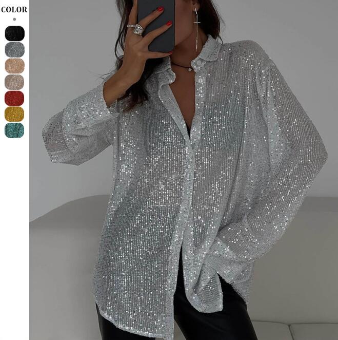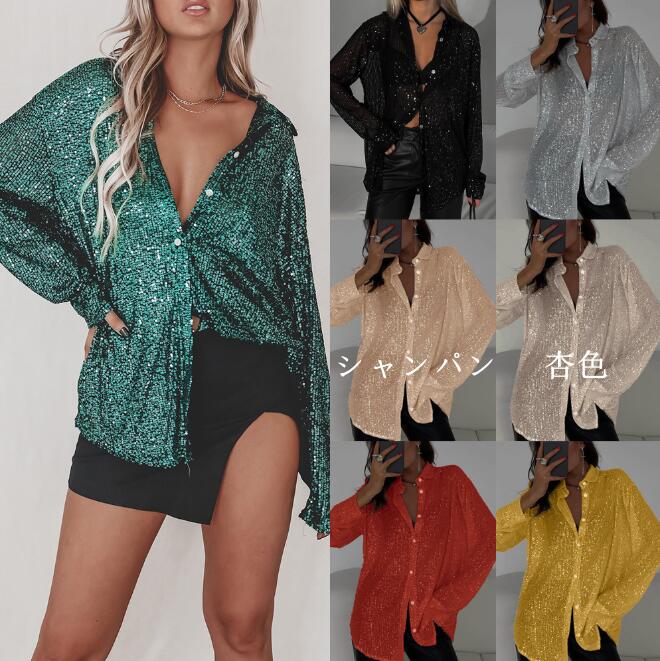 スパンコールシャツ レディース 長袖 トップス シャツ ブラウス 新登場! ブラック ホワイト グリーン シャンパン 杏色 レッド ゴールド S M L XL XXL 3XL