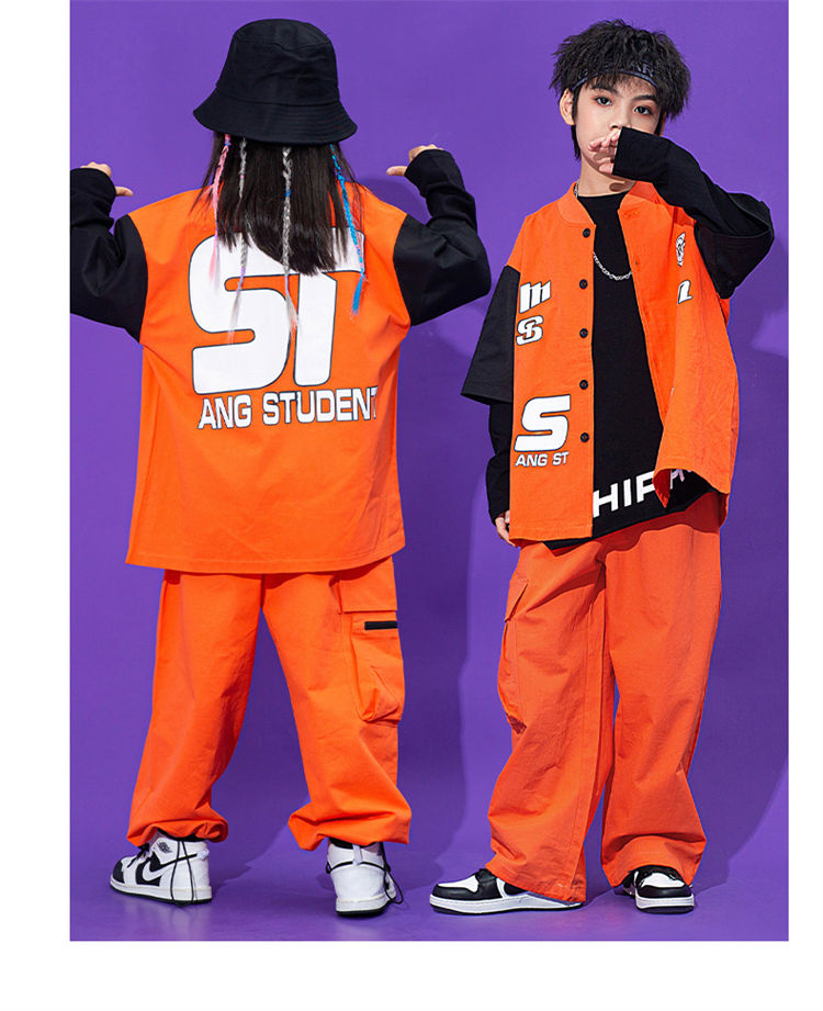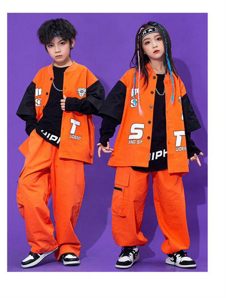 キッズダンス ヒップホップ トップス キッズ スーツ カジュアルセットアップ カジュアルパンツセット 早い者勝ち 110 120 130 140 150 160 170 180 二点セット 三点セット オレンジトップス オレンジパンツ 黒インナー
