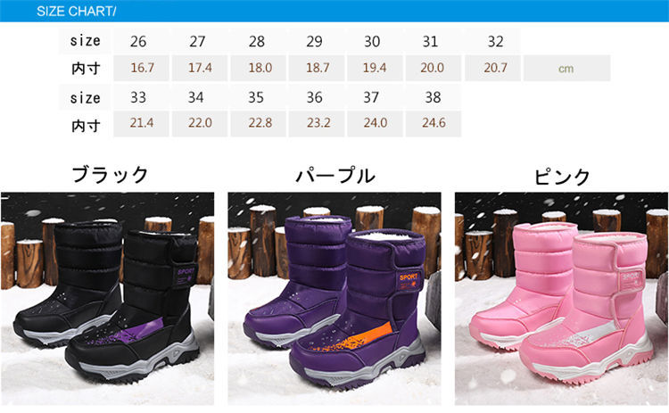 スノーブーツ キッズ 雪遊び 裏ボア キッズ ベビー マタニティ 新作 ブラック パープル ピンク 26・内寸16.7cm 27・内寸17.4cm 28・内寸18cm 29・内寸18.7cm 30・内寸19.4cm 31・内寸20cm 32・内寸20.7cm 33・内寸21.4cm 34・内寸20cm 35・内寸22.8cm 36・内寸23.2cm 37・内寸24cm 38・内寸24.6cm