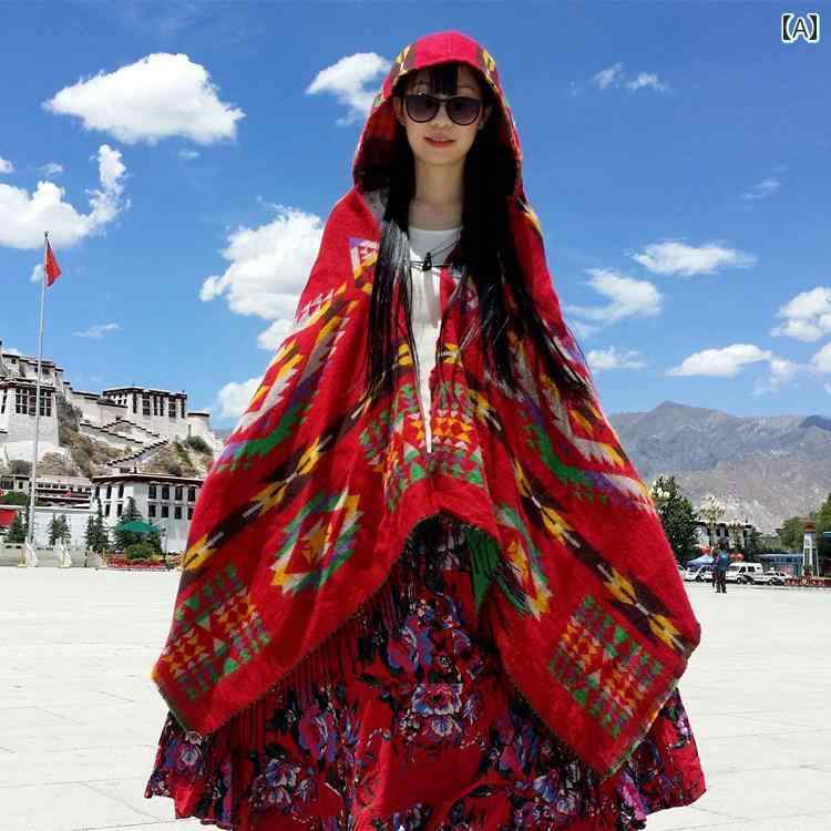 レディース ショール 大判ストール マント 秋冬 厚手 保温防寒 首元前カット カーディガン風 200*80cm フード付き ポケット付き エレガント エスニック幾何学柄 ボヘミアン 旅行用 カラフル