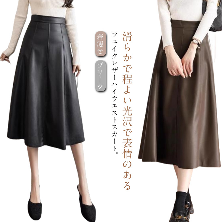 Aライン レザースカート フレアスカート ロングスカート 合皮 ミモレ丈 秋冬 ボトムス 体型カバー 着痩せ 革スカート きれいめ 大きいサイズ 通勤 上品 膝丈 プリーツ 着やせ
