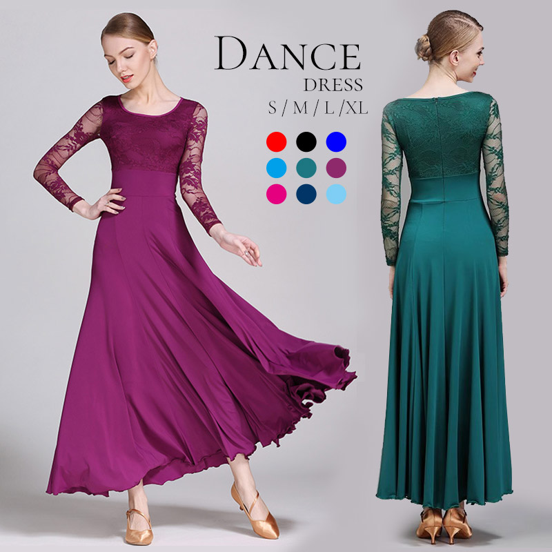 社交ダンス衣装 モダンドレス ラテンドレス スタンダードドレス ワルツダンス レース ふわふわ ロングワンピース マキシ丈 ラテン衣装 社交ダンスドレス 大きい裾 豪華なドレス ノースリーブ