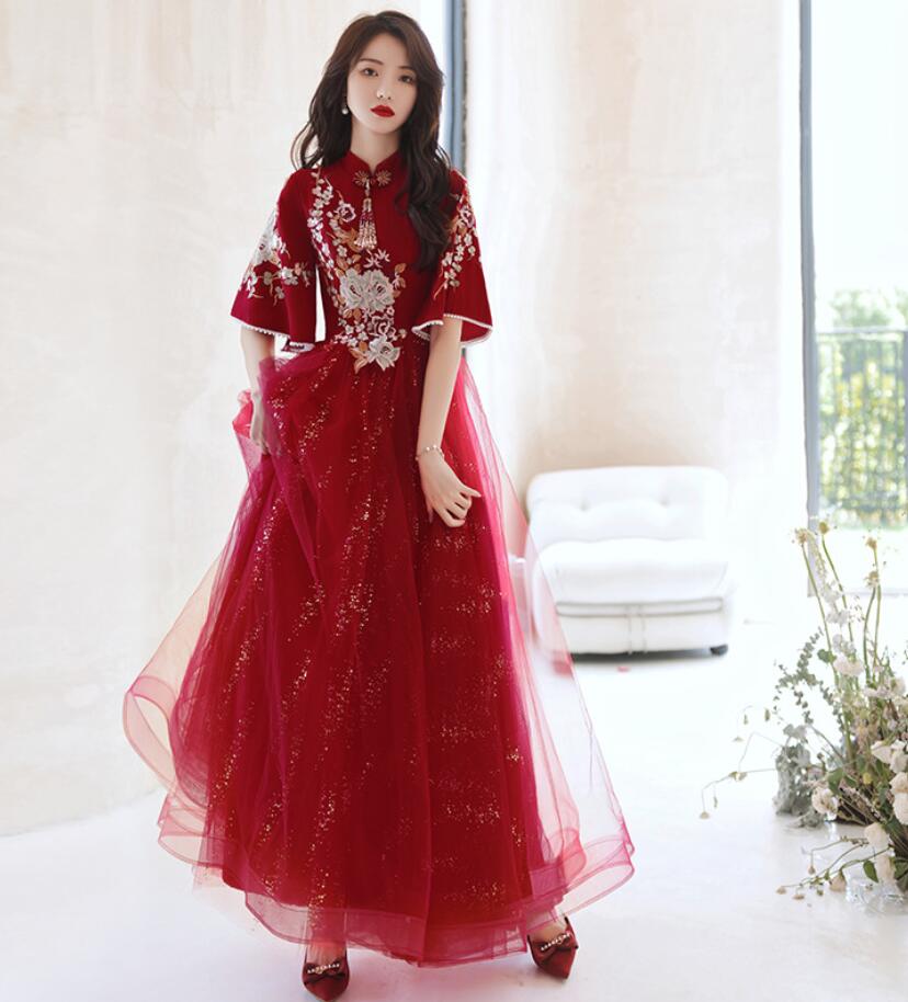 ロング チャイナドレス パーティードレス 五分袖 スパンコール チャイナ風 結婚式 ウェディングドレス 中華服 チャイナ服