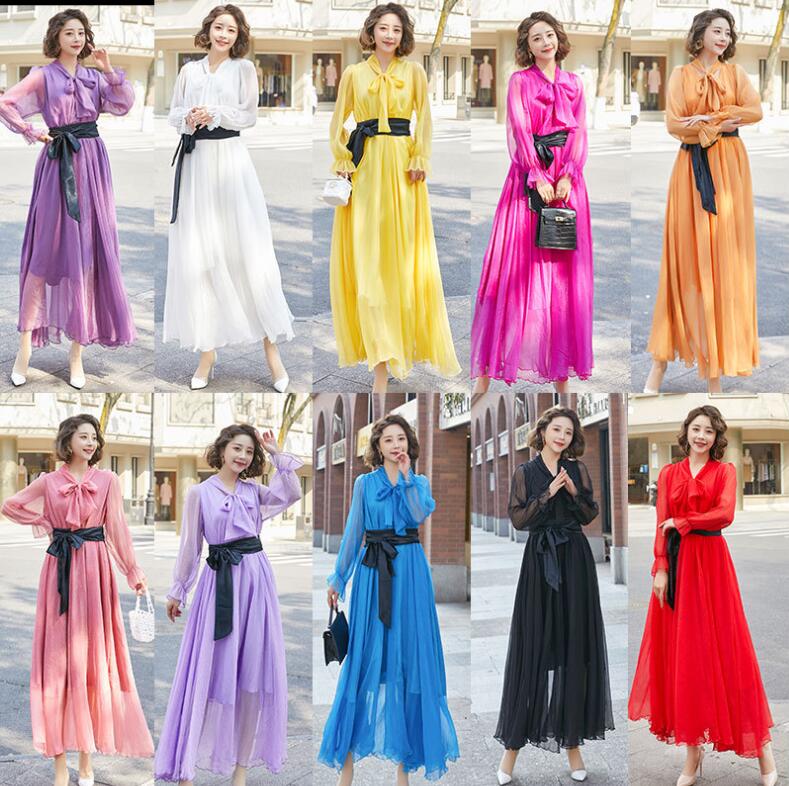 マキシ丈ドレス レディースダンス 春秋 長袖ドレス ロング丈ドレス ネック 黒ベルト 大きい裾ワンピース 通勤 普段着 海旅行衣装 花見 撮影衣装 おしゃれ ドレス 多色 カラフルドレス