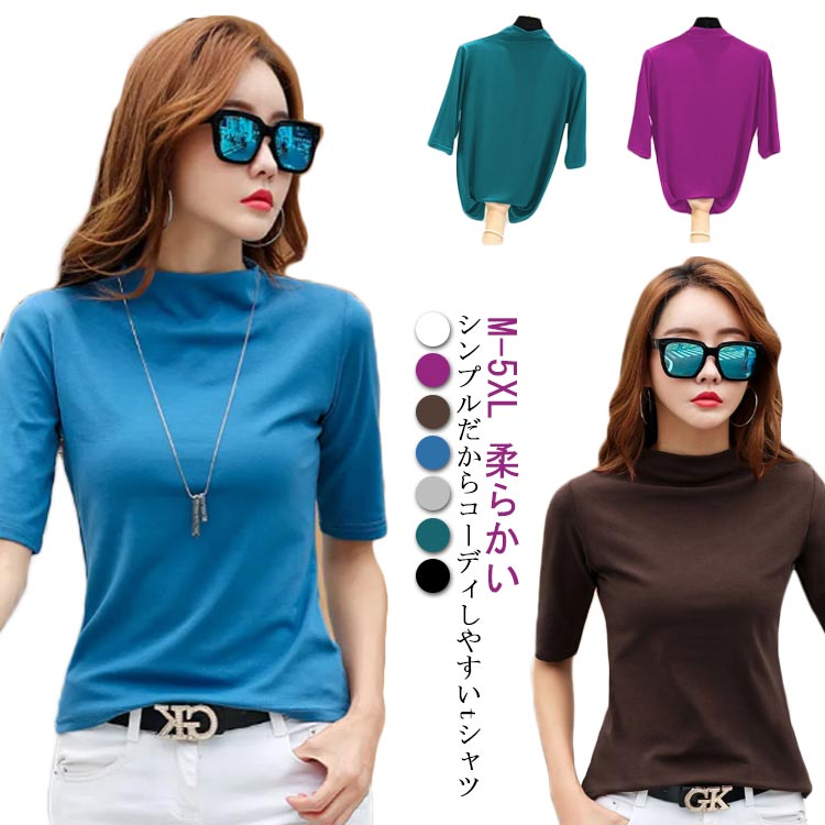 秋冬 薄手 カットソー 半袖 レディース 紫外線対策 UVカット 五分袖 柔らかい ハイネック 日焼け対策 ボトルネック 快適 tシャツ 春夏 プレゼント 重ね着 無地 シンプル 半袖Tシャツ