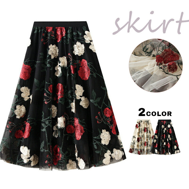 ロング チュールスカート ミモレ スカート バラ刺繍 プリーツスカート ライン レディース ボトムス