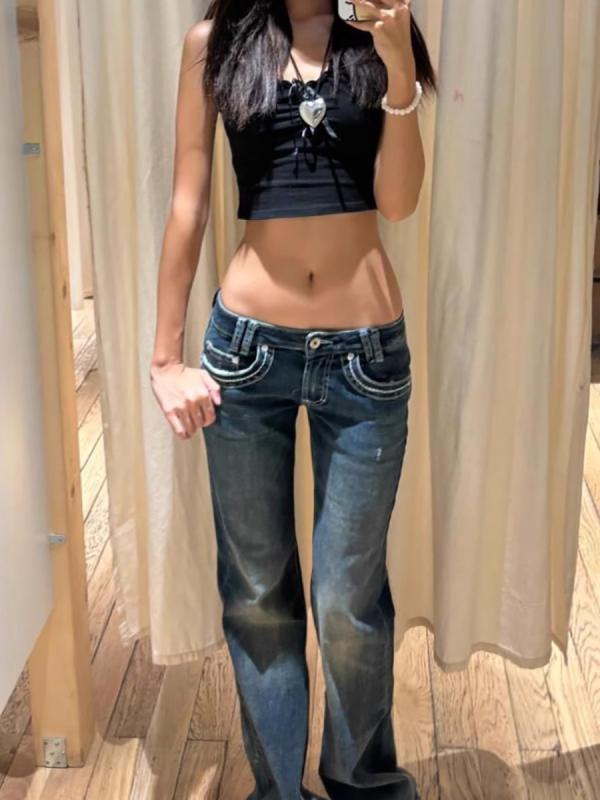 デニムパンツ レディース おしゃれ カジュアル ローライズ ブーツカット 刺繍 ウォッシュ加工 美脚 ヴィンテージ風