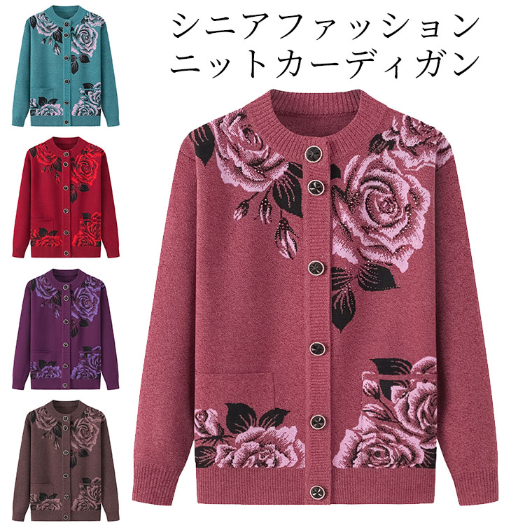 シニアファッション ニットカーディガン おばあちゃん 花柄 バラ柄 裏起毛 暖かい あったか レディース おしゃれ アウター 80代 70代 60代 90代 秋冬 プレゼント ギフト お誕生 フリース