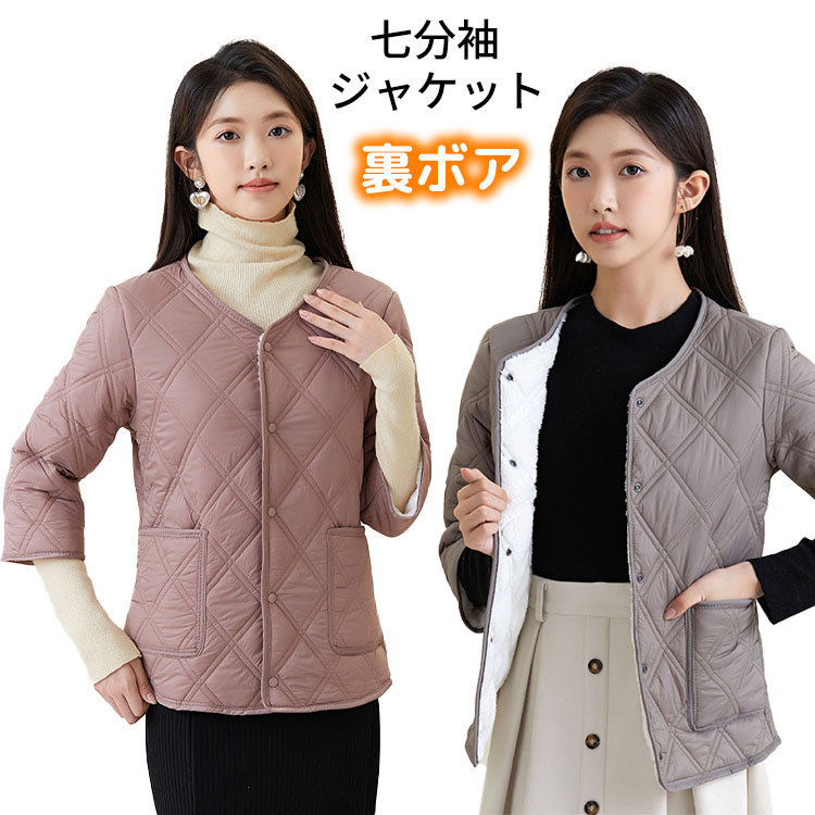 七分袖ジャケット 中綿ジャケット レディース ダウンジャケット 裏ボア 裏起毛 軽量 シンプル 無地 ポケット付き Vネック 保温 暖かい あったか インナー アウター 寒さ対策 冷え対 カーディガン