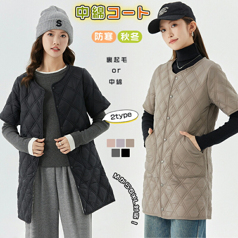 中綿コート 中綿 ジャケット アウター レディース 半袖 キルティング 防寒着 裏起毛 コート 防寒 体型カバー 2WAY 軽量 防風 ボリューム 無地 羽織り 秋冬 Vネック ポケット付き トップス