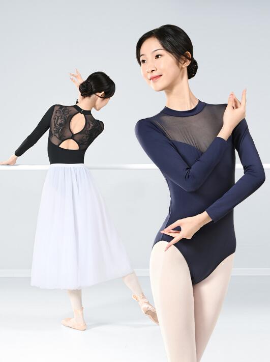 バレエ レオタード 大人 長袖レオタード チュール レース シースルー 新体操 練功服 演出服 レッスン着 ステージ衣装 ブラック ネイビー 可愛い
