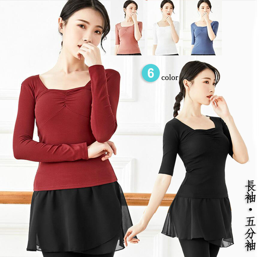 ダンストップス レディースヨガシャツ フィットネスウェア 長袖/五分袖 スクエアネック ダンスウェア ダンス稽古 レッスン着 細見え