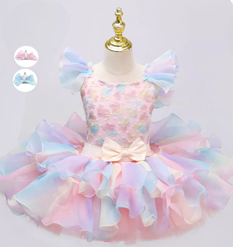 子供 ダンス ワンピース キッズ バレエ ドレス ショート丈 ふわふわ チュチュドレス マルチカラー ボリューム ティアード レオタード 体操 コンクー 女の子