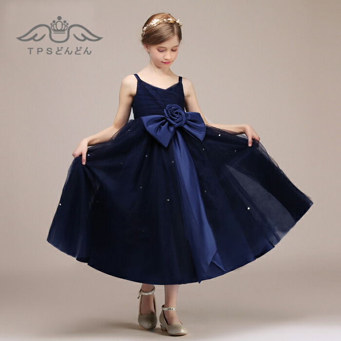 子供ドレス 発表会 ピアノ発表会 ジュニア ロング ドレス 演奏会 結婚式 キッズ ワンピース フォーマル コンクール コンサート 七五三 高級 ネイビー 120 1 大きなリボン