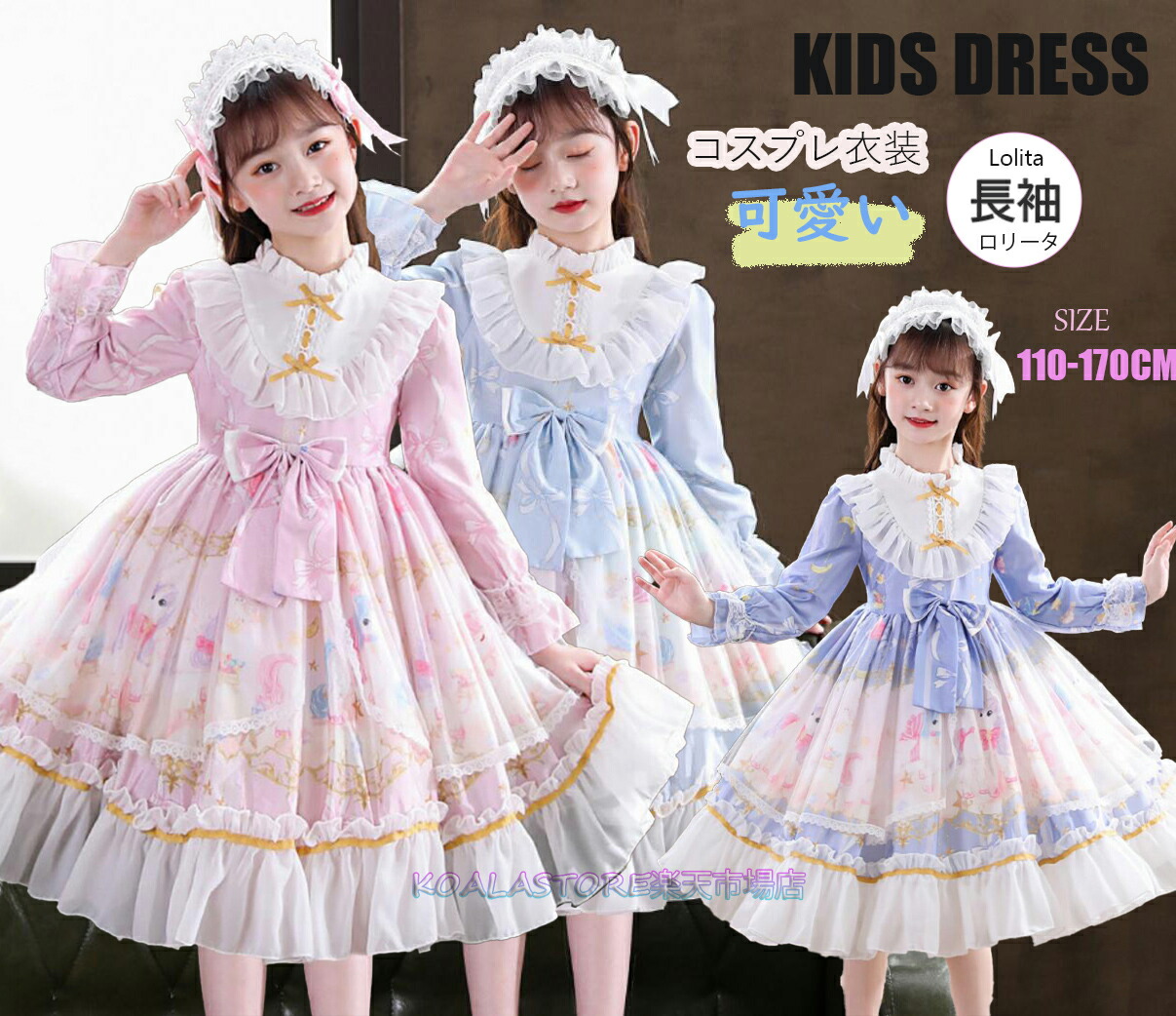 ロリータワンピース 子ども長袖ワンピース 子供ロリータ服 lolita キッズドレス ゴスロリ チュール フリル 甘ロリータ プリント柄 姫様ドレス お姫様コスチューム コスプレ衣装 学園祭 ジュニア