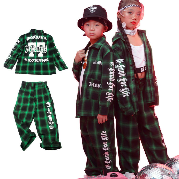 グリーン 緑 チェックシャツ パンツ キッズ ダンス衣装 セットアップ ヒップホップ ギンガムチェック 女の子 男の子 シャツ 長袖 ガールズ b系 ダンス ジュニア ストリート系