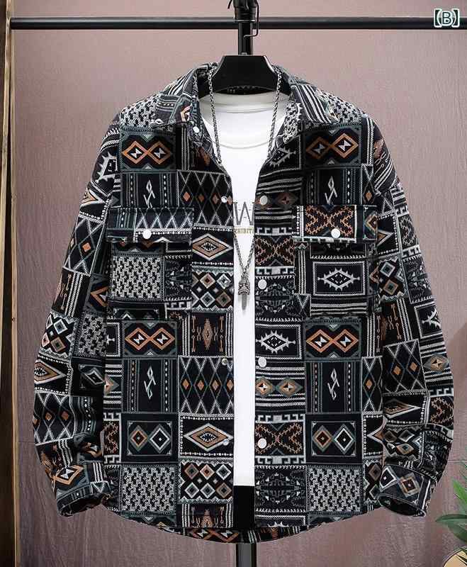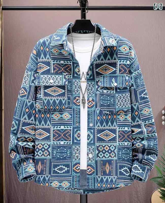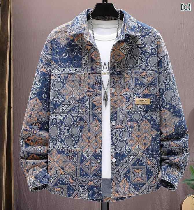 シャツ メンズ カジュアル 春秋 ジャケット 羽織 長袖 ポケット デニム プリント 通気性 耐摩耗性 色褪せにくい 毛玉防止 普段使い 旅 エスニック 幾何学模様 青 黒 大きいサイズ