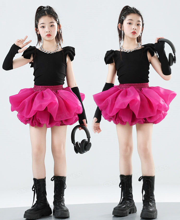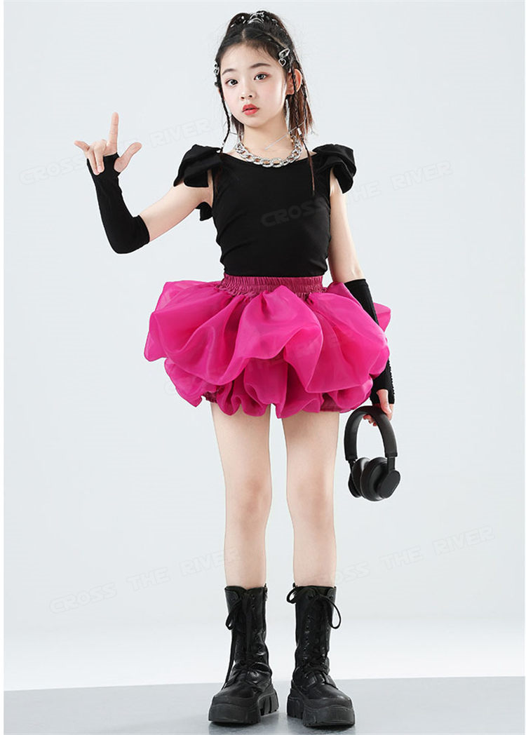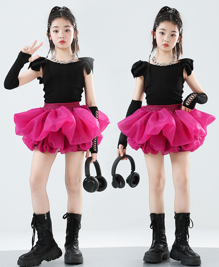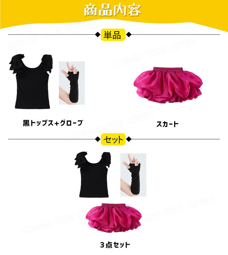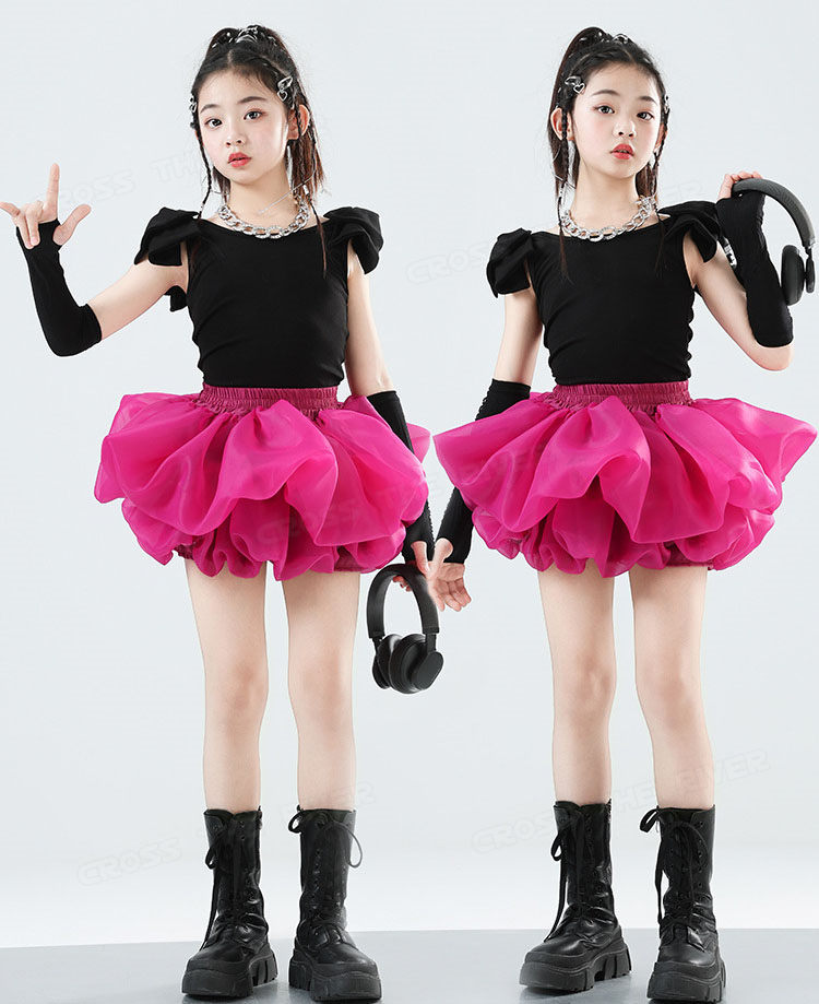 k-pop 衣装 キッズダンス衣装 セ 体操 ダンス 社交ダンス ウェア 特集 黒トップス+グローブ スカート 3点セット 110 120 130 140 150 160 170 180