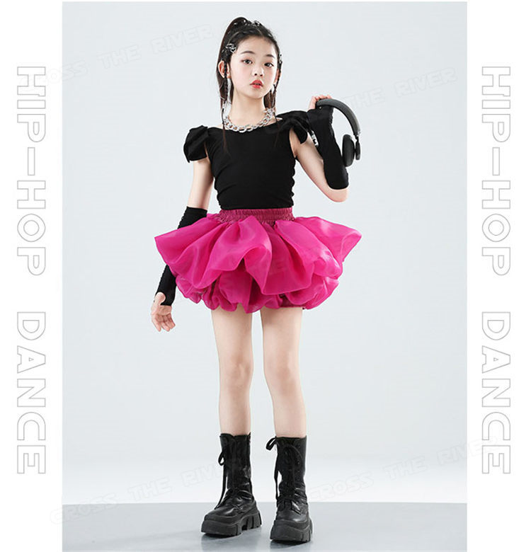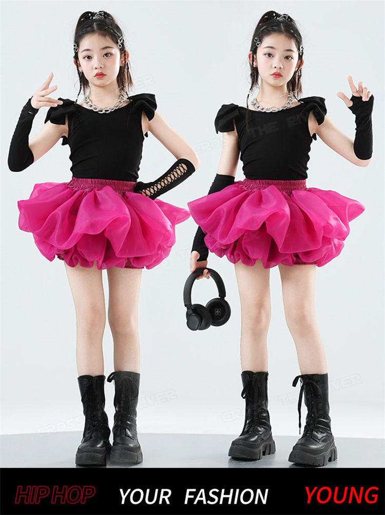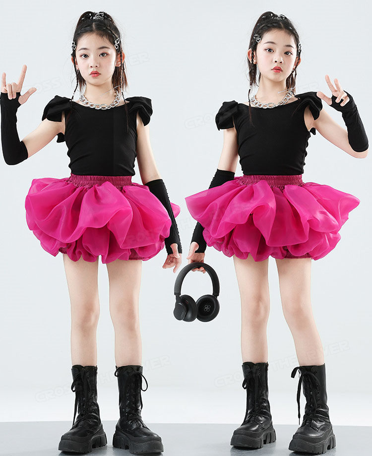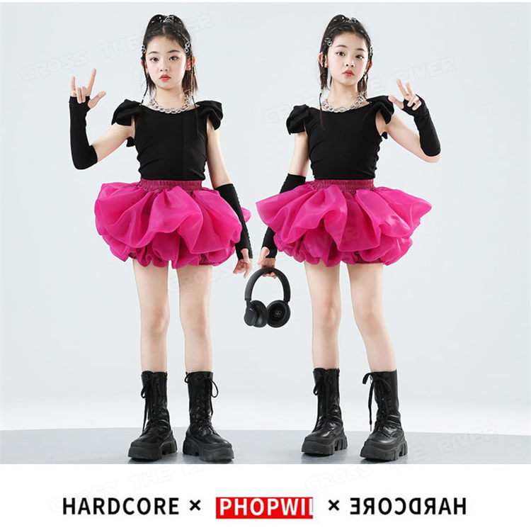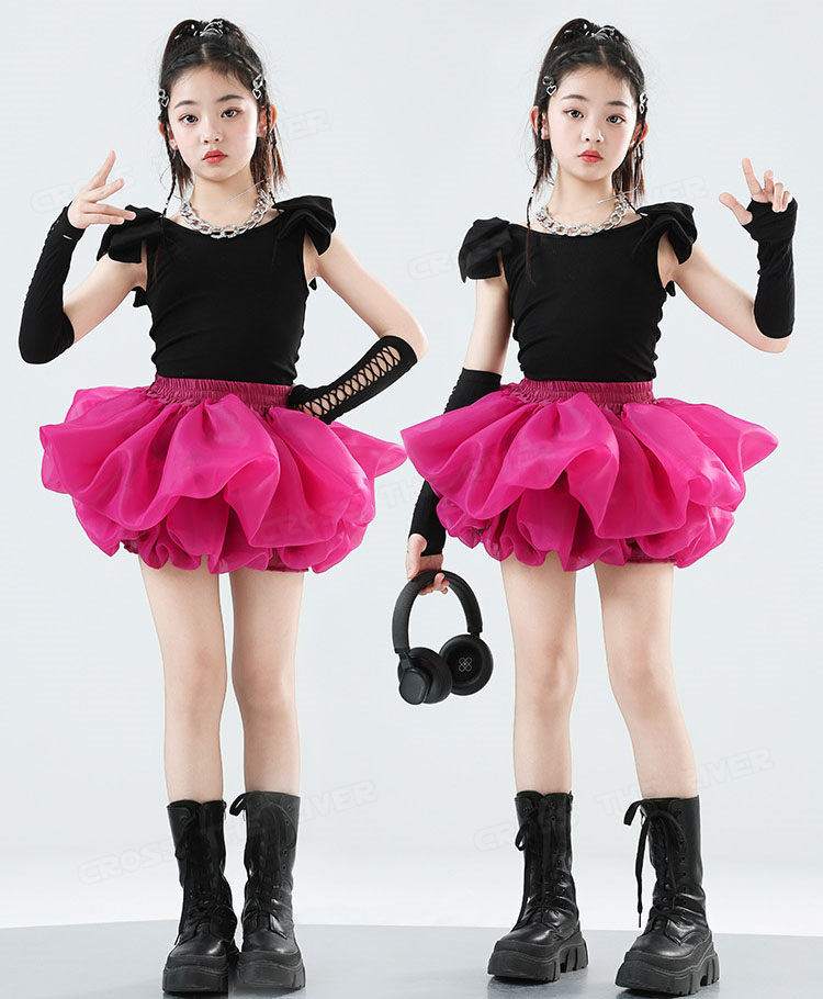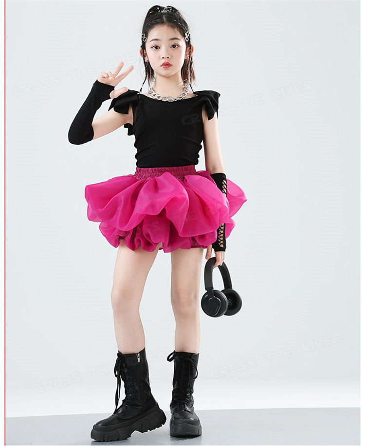 k-pop 衣装 キッズダンス衣装 セ 体操 ダンス 社交ダンス ウェア 特集 黒トップス+グローブ スカート 3点セット 110 120 130 140 150 160 170 180