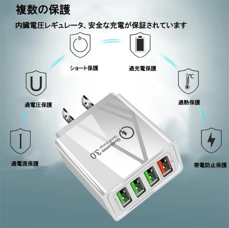 ACアダプター チャージャー USB4ポート USB急速充電器 3.1A超高出力 高速充電 急速出力 ハイパワー 電源アダプター 全ポート全てが急速充電対応 IOS Android対 4台同時充電可能