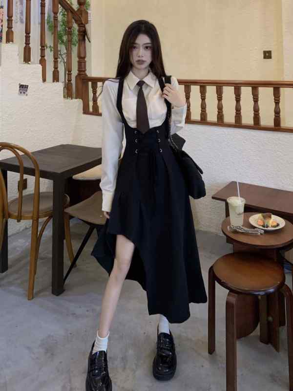 ジャンパースカート 大人 レディース 春夏 アメリカン カレッジ 長袖 半袖 シャツ ネクタイ Aライン ロング 黒 セット
