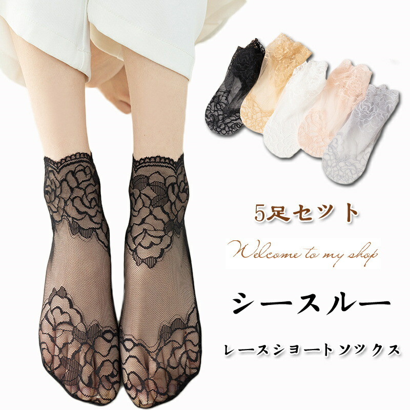 5足セット ソックス レースショートソックス レディース シースルー シアー 花柄 レース 脱げにくい フットカバー