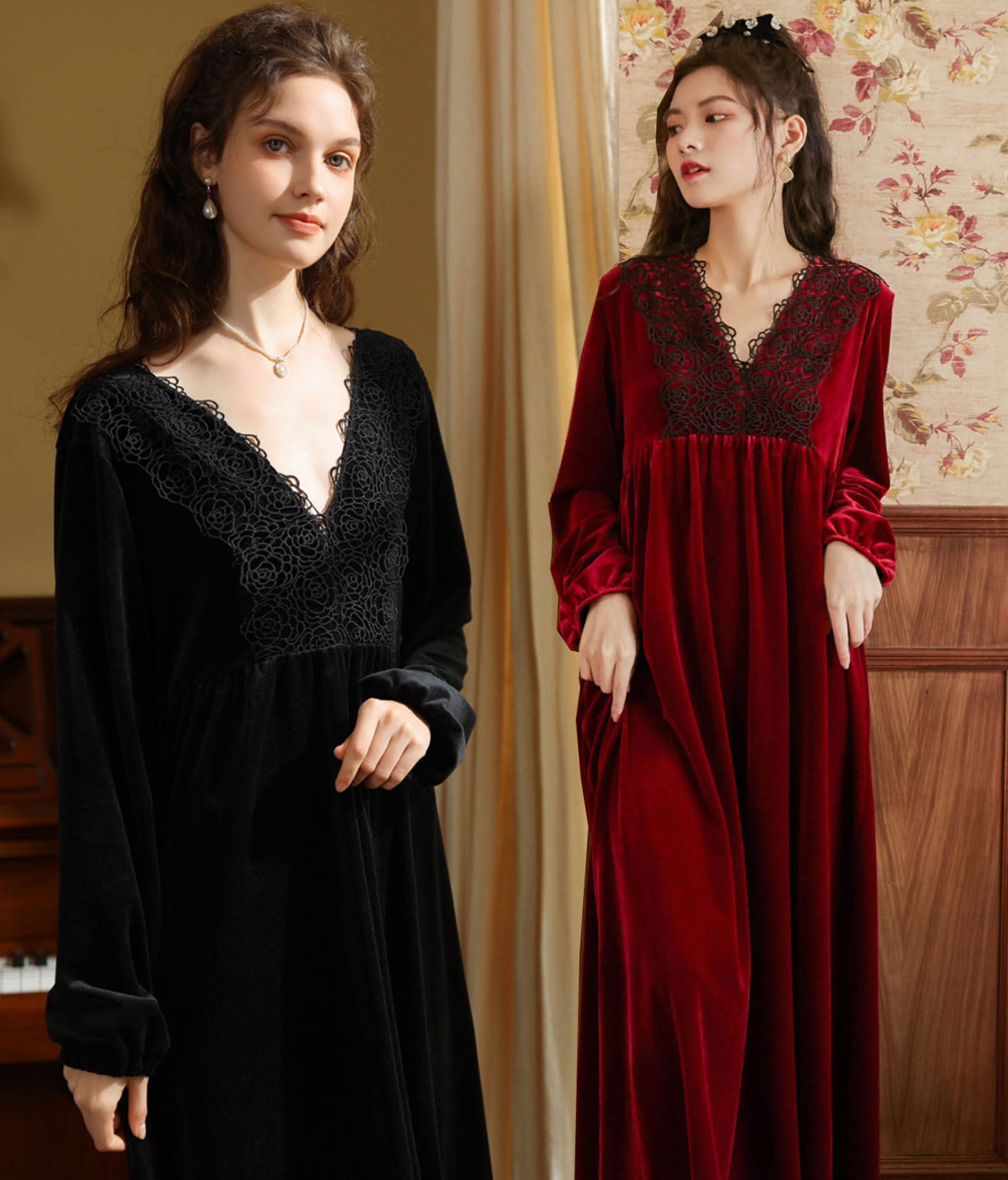 秋冬向け ネグリジェ レディース 長袖 ロング丈 Vネック レース 花柄 ゆったり お姫様 ワンピース パジャマ 厚手 もこもこ 体カバー ルームウエア 黒 ワインレッド ピンク 部屋着
