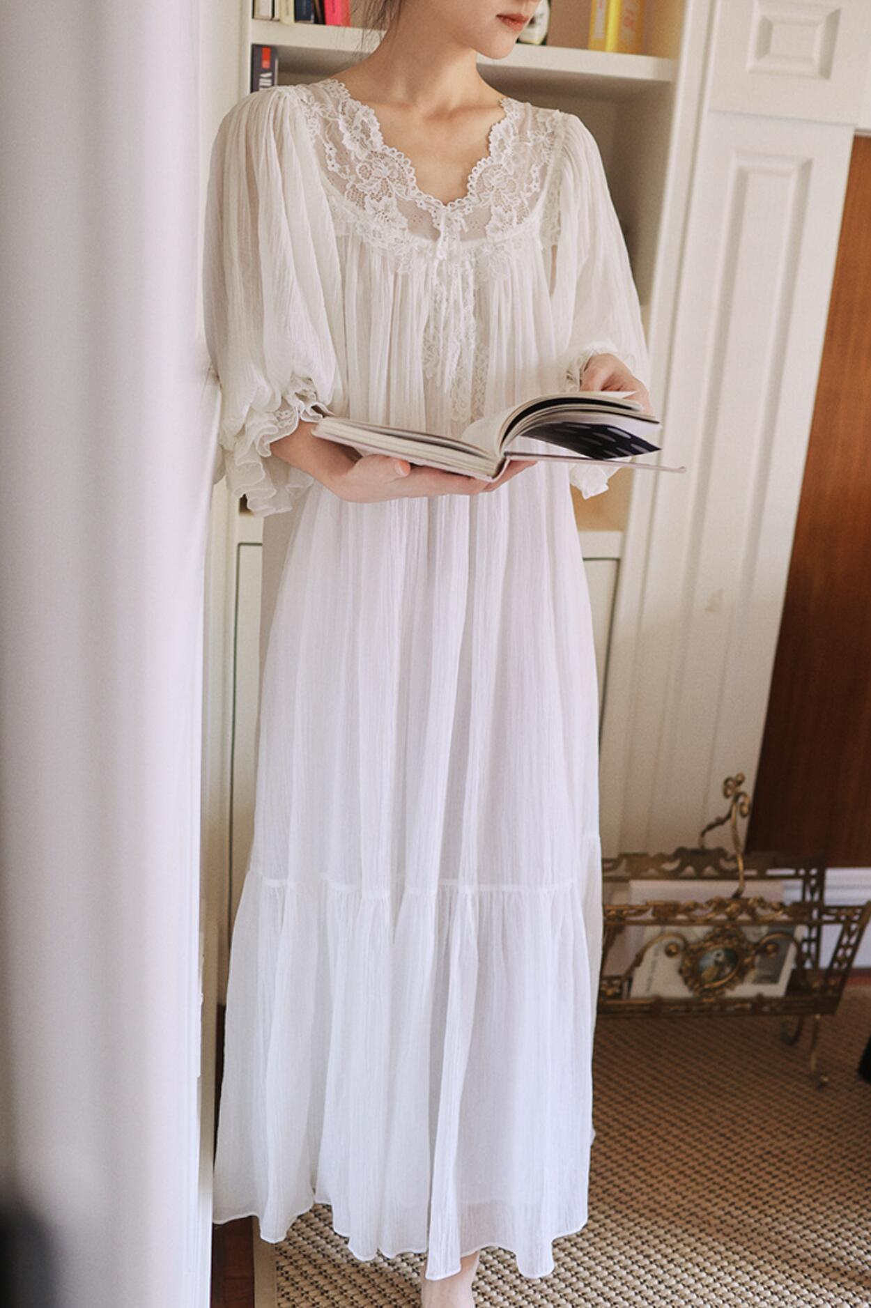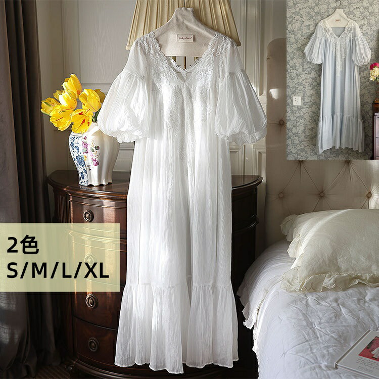 春夏秋向けのロングネグリジェ 綿ガーゼ ワンピース パジャマ ゆったり ロング丈 ネグリジェドレス ルームウエア パフスリーブ 七分袖 お姫様系 部屋着