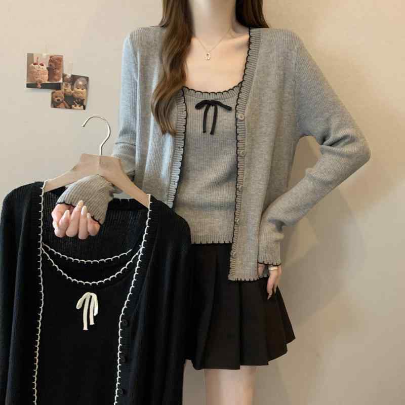 アンサンブル ニット レディース 大きいサイズ キャミソール カーディガン リボン トップス おしゃれ グレー ブラック 韓国