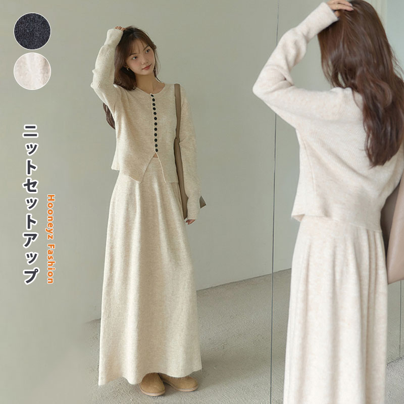 ニットセットアップ レディース セーターセットアップ 秋冬 2点セット スカートスーツ 厚手 ニットカーディガン+スカート セーター 前開け ボタン ゆったり Aライン 長袖 リブ ツーピース ロング